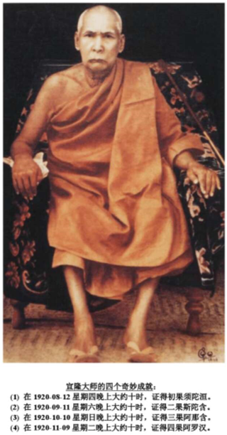 就在1920119日星期二晚上大约十时,在禅修时,他看见一个壮丽、有盖的通道(朝向着一座塔);同一时间,有一飞行战车从天而降,发出嗡嗡的响声,向着他逼近,他没有理睬它,只专心一意地禅修;尽管如此,他还是感到被抬起来,体重好像突然减轻了很多,跟着便发觉自己坐在那辆战车上面。当他环顾一下四周时,看见在战车的四个角位正站着四大天王(欲界第一天的护世四天王),而帝释(欲界第二天,即忉利天的天主)则站在自己的右边。他相信由于自己即将证得出世间智,这些天界要人是专程来保护自己的。于是他没有丝毫改变坐姿,继续在禅修上埋头苦干,迅即证得四果出世间智,即四果阿罗汉。