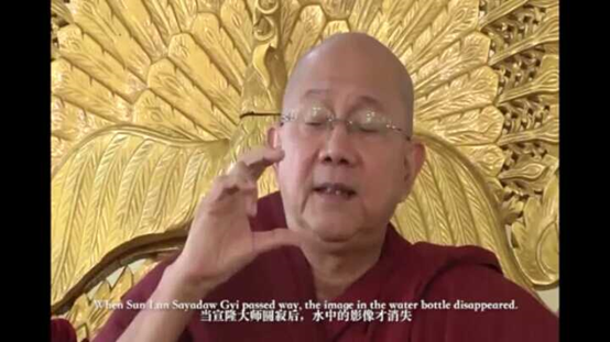 于是屋子里的主人就修了一个临时屋子,所有的信徒才有了地方可以(向孙伦大师)致敬,水中的影像一直存在到大师圆寂。一直到了1-2个月之后,孙伦大师圆寂了,当孙伦大师圆寂后,水中的影像才消失。因此他展现了他的神通,站在太阳里,以如此的方式向大家告别,当时我们非常幸运地在离他400英里的仰光目睹了这个奇迹。